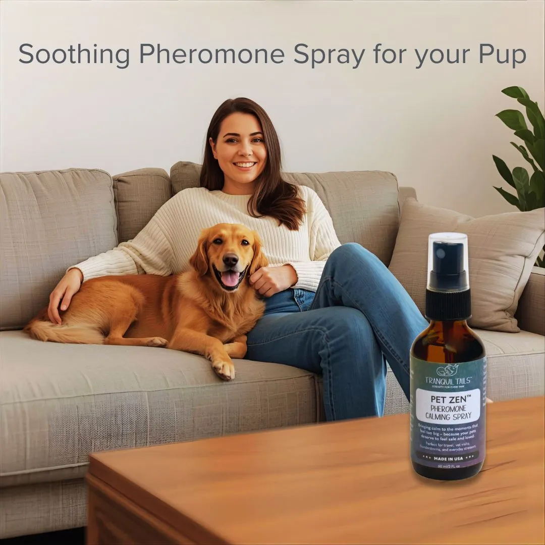 Pet Zen pheromone spray from Tranquil Tails is a gentle, calming spray formulated to help reduce stress and anxiety in your dog or puppy without synthetic fragrances. Whether it’s a stressful car ride, a vet visit, or a thunderstorm, Pet Zen helps your pup feel safe and calm and is a perfect complement to our plug-in diffusers.